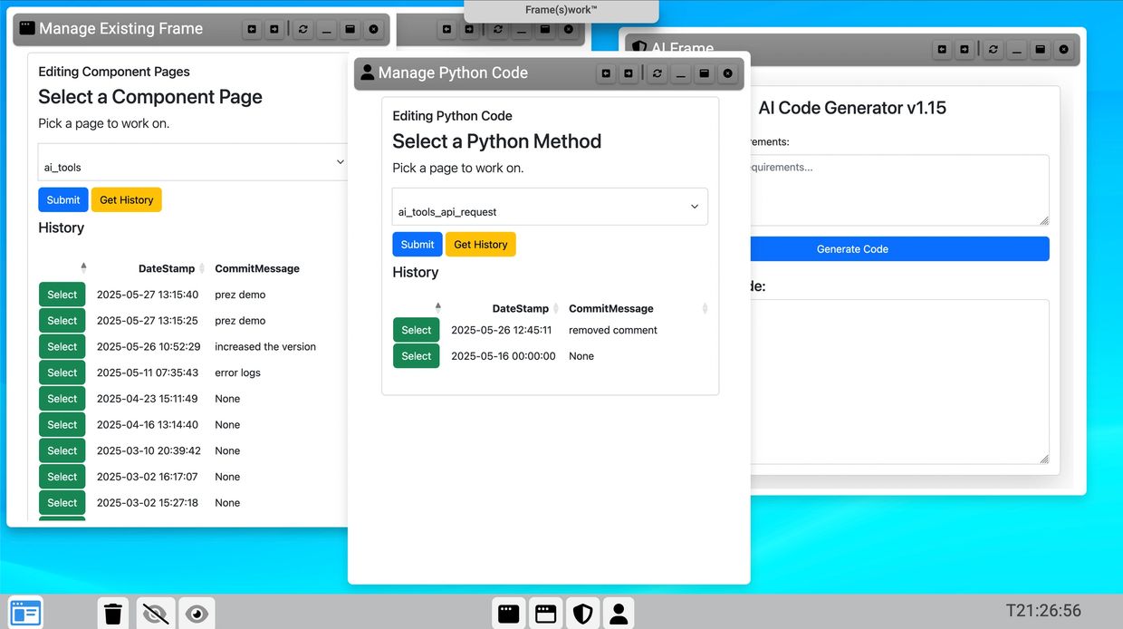 Version control is no longer just for source code. In Frames, built-in versioning applies directly to code, configuration, and even data behavior. Every change—whether it’s a tweak to a form layout or a new Python module—is stored as a new version in the database, complete with metadata and rollback capabilities.