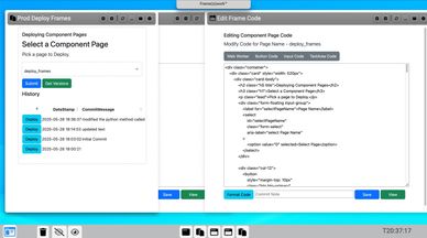 In a traditional web stack, deploying code means coordinating between repositories, build servers, FTP uploads, and runtime configurations. Frames changes that paradigm entirely. All code lives in the database, and deployment is as simple as inserting new records into the production instance.
